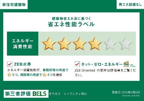 さらに本物件は、断熱性・省エネ性能に優れた環境にやさしい建築物として「BELS※3」の4 つ星および「ZEB Oriented※4」を取得しました。室内環境の快適性は損なわずに建物が消費するエネルギー量を削減することで、省エネ環境に貢献していきます。なおZEB Oriented の認証取得は、オウカスシリーズでは初となります。