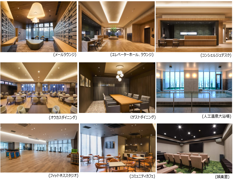 共用部は、エントランスラウンジは天井高約3.6mという贅沢な開放感が堪能できる大空間。居住者が自然と集まり、来訪者やスタッフとの交流を生む心地よい雰囲気を醸成します。またコンシェルジュデスク横のオープンスペースに設けたメールコーナーの他、用途に応じて小スペースに仕切ることができる広いダイニング、待ち合わせや団らんスペースとして利用できるラウンジ、地域開放を見据えたフィットネス・カフェ、映画鑑賞やカラオケなど様々な趣味・娯楽を楽しめる娯楽室など多彩な空間を設けました。