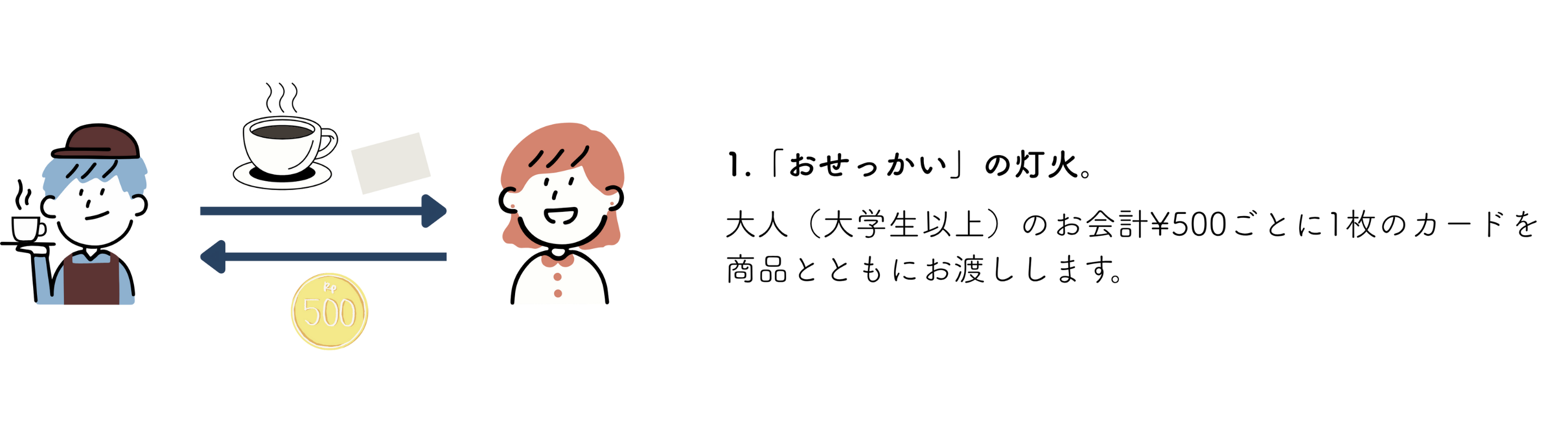 大人(大学生以上)のお客様には、お会計500円ごとに「おせっかいカード」を1枚お渡しします。