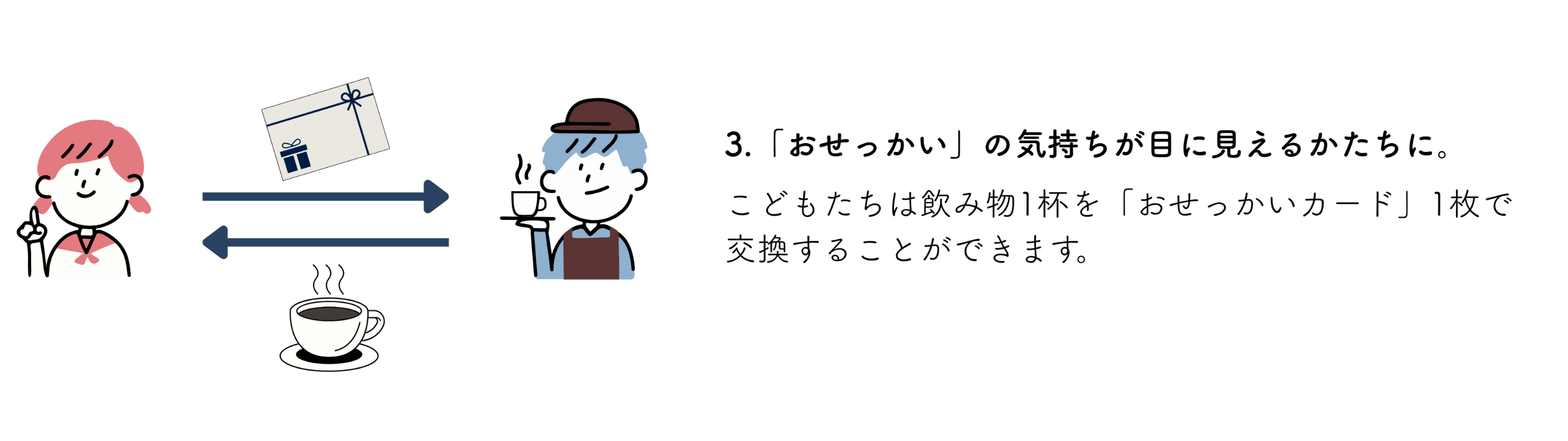 大人(大学生以上)のお会計500円ごとにカードを1枚進呈。メッセージを書けば、こどもが1杯のドリンクと交換できる「おせっかいカード」に。大人のやさしさが、まちをめぐる新しい仕組み。