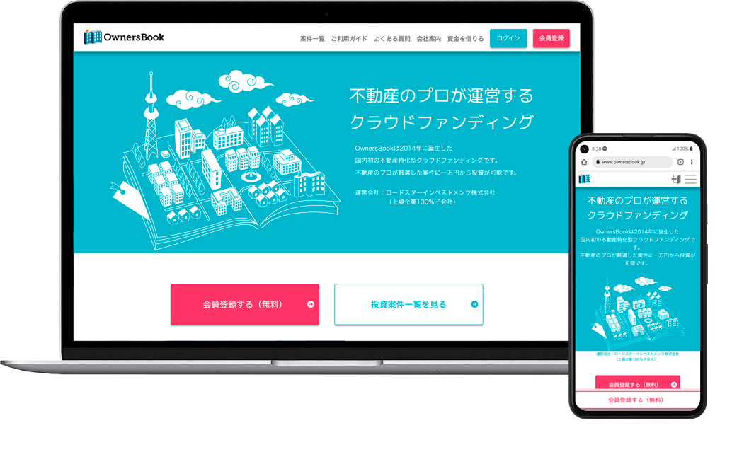 『OwnersBook』は、「オンライン・1口1万円・プロ向け案件・不動産投資」というコンセプトでプロ向け不動産投資領域を個人に開放し、不動産投資の醍醐味を味わって頂くとともに、皆様と一緒に新しい不動産投資市場を創造するサービスです。