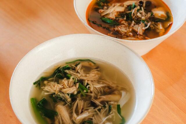 牛だしスープとユッケジャンスープの2種類があり、どちらも本格的な味わい。