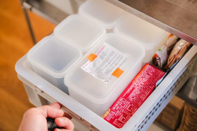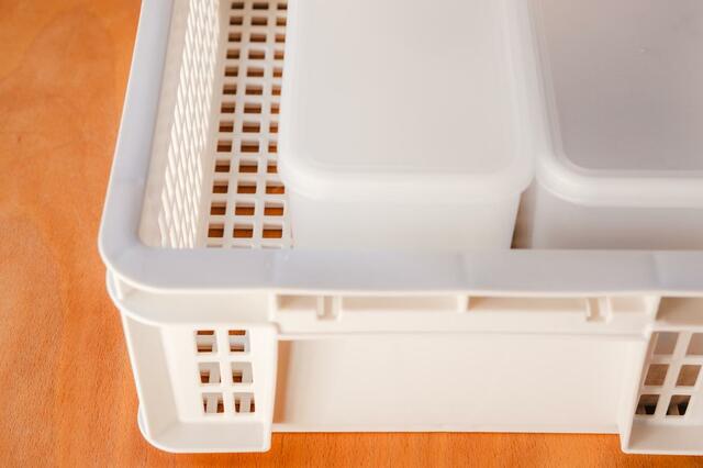 もう1つの通函にはそのまま大きめの調理器具を入れ、残りの「通函 メッシュ」には、「粉もの保存容器」を組み合わせています。