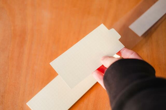 その他、新商品で買ってよかったのが「書きこめるしおり インデックス付」。短冊状のメモなんですが、真ん中で折るとインデックスとしても使えるようになっています。