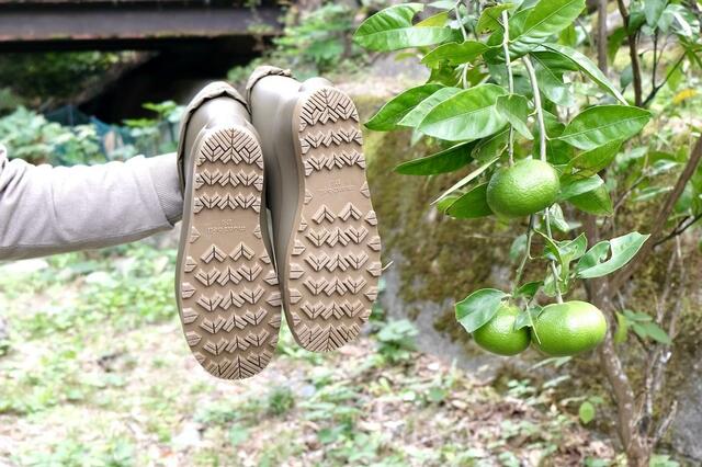 登山靴と比べると、あっさり目のブロックパターンで、霜が溶けてぬかるんだ庭でも泥が詰まりにくそうです。
