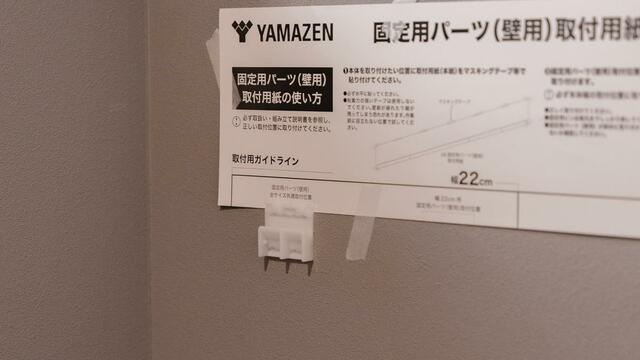 取付位置を決めたら、付属のガイド用紙を壁に貼り付けます。この時に、水平器があると便利でした。