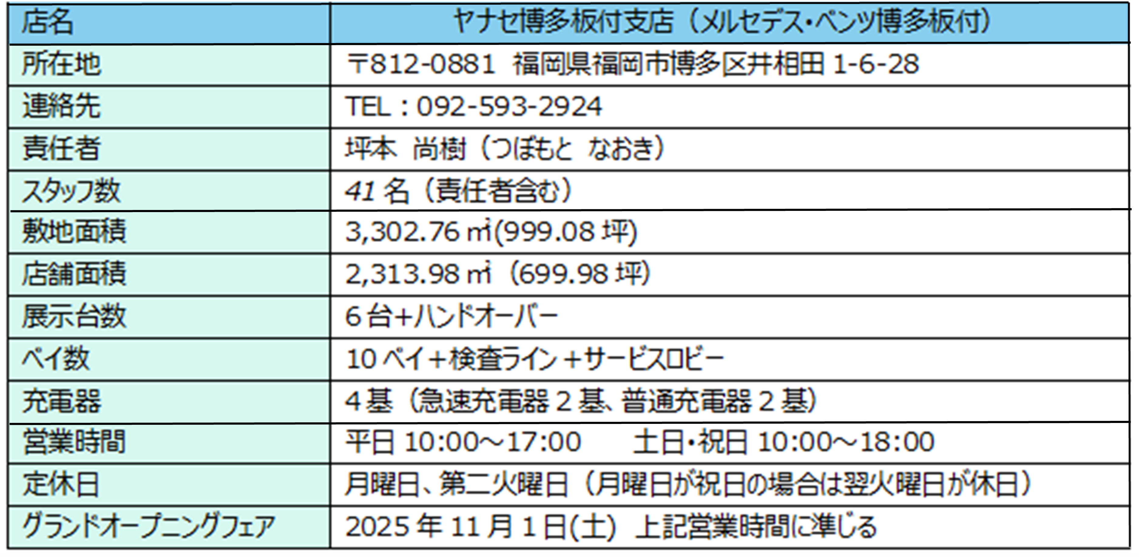株式会社ヤナセ(社長:森田 考則)は、ヤナセとして九州エリア2拠点目となる最新のメルセデス・ベンツ ショウルームCI、「MAR20X(エムエーアール・トゥエンティ・エックス)」を採用した「ヤナセ博多板付支店」(メルセデス・ベンツ博多板付)の営業を11月1日(土)に開始します。