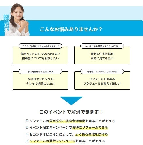 主人には内緒だったけど、まずは私一人でイベントに参加してみました。チラシを見て、最近のキッチンやお風呂はどんなのか見てみたいなと思って。色々な商品があったけど親切に説明してくださってよくわかりました。まだリフォームするかどうかも分からない私にも親身に教えて嬉しかったです。帰って主人に話して、もう一度一緒に来てもらおうと思いました。