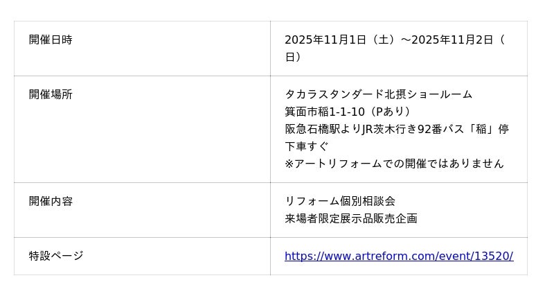 全国でリフォーム・リノベーション工事を年間6,500件以上手がける株式会社アートリフォーム(本社:大阪府吹田市、代表者:代表取締役社長 大本哲也、以下「アートリフォーム」)は、タカラスタンダード協賛、「実機を見て、触って、体験できる!アートリフォーム秋の水回りリフォームフェア」を2025年11月1日(土)~2日(日)に、タカラスタンダード北摂ショールーム(大阪府箕面市稲)にて開催します。タカラスタンダード社との共同開催イベントは今回が初の取組みとなります。