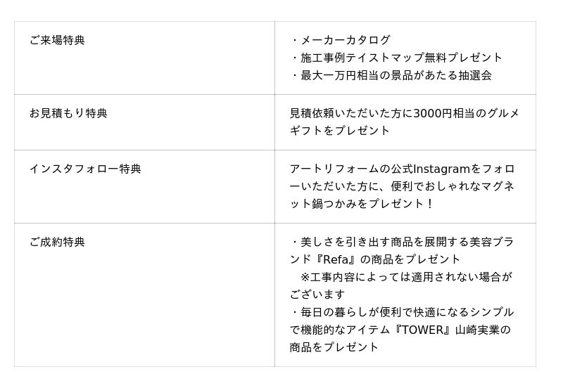 当社は、お客様だけでなく従業員や取引先など、アートリフォームと関わるすべての人たちに対して価値を提供し、業界全体を魅力的に変えていくことを目指しております。「業界全体を魅力的に変えていく」というビジョンを実現するためには、より多くの生活者にリフォームやリノベーションで実現する豊かな暮らしを肌で感じてもらい、リフォームの価値を感じていただく必要があります。本イベントの開催を通してリフォームの価値を啓蒙することで業界全体の価値向上につながり、ひいてはそれが一人ひとりの生活者の豊かな暮らしの実現につながると考えております。