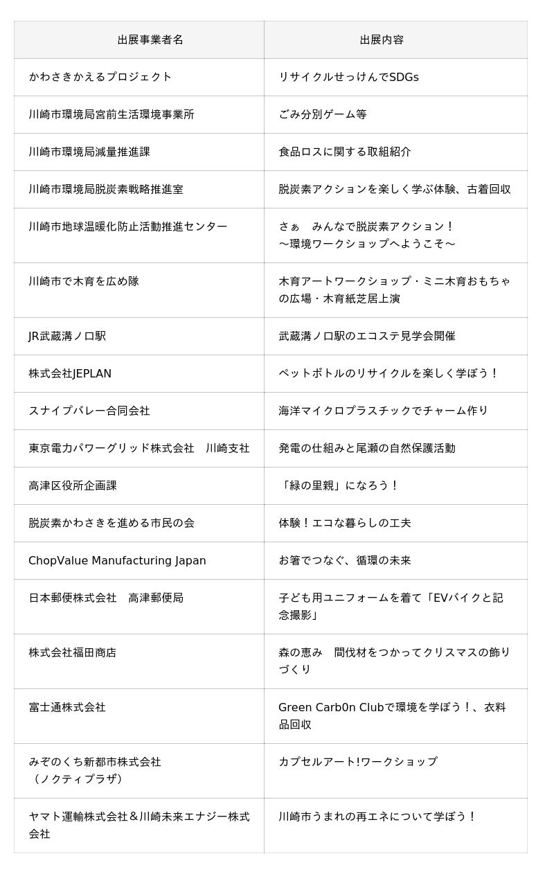 また、高津区を拠点に活動する企業や団体が、資源の循環やアップサイクル、再生エネルギーなどを身近に感じるワークショップを開催するほか、荷台が透けて見えるごみ収集車の体験、市立高津高等学校書道部による「脱炭素」を題材にしたパフォーマンスなど、脱炭素を体感できる様々な企画を実施します。