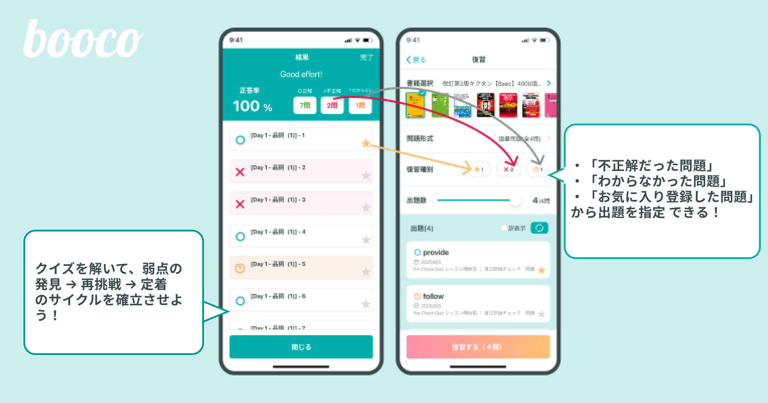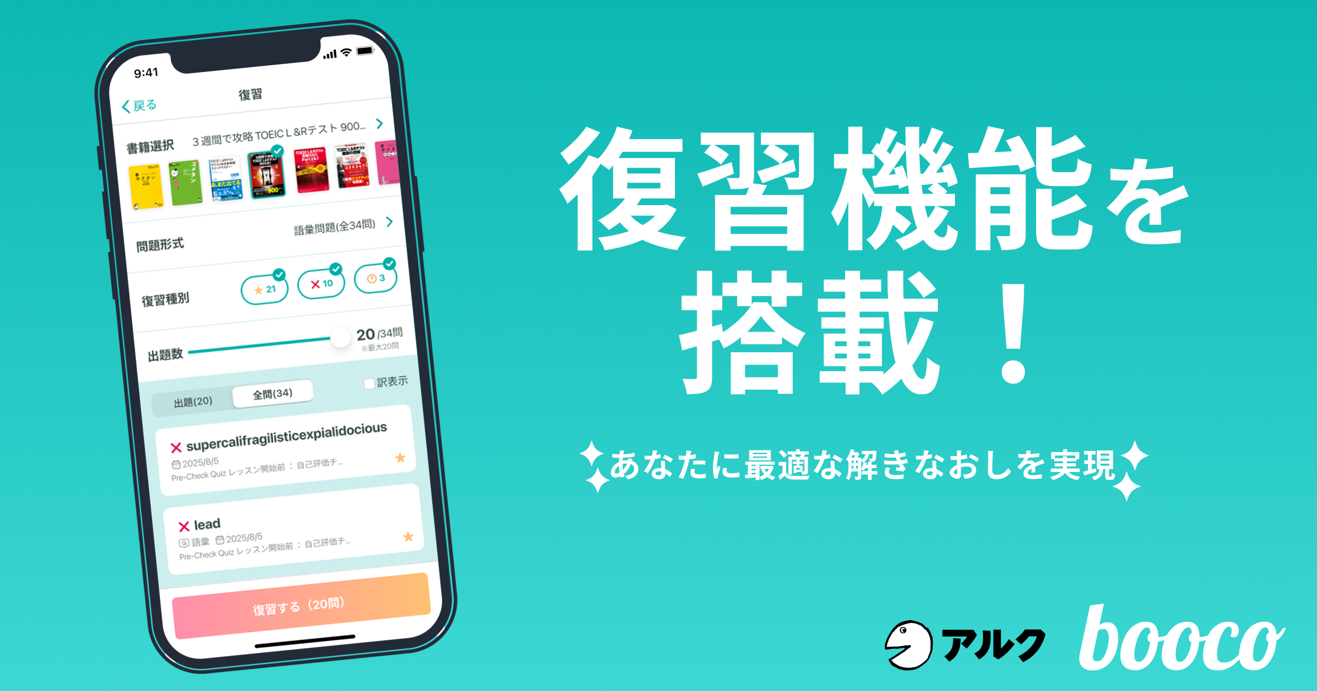 株式会社アルク(本社:東京都品川区北品川6-7-29 ガーデンシティ品川御殿山、代表取締役社長:田中 伸明)は、同社が提供する英語、韓国語などの語学学習アプリ「booco(ブーコ)」において、学習機能の中核である「クイズ機能」をリニューアルし「復習機能」をリリースいたしました。今回のアップデートでは、クイズを解いた後に間違えた問題やお気に入り登録した問題を自由に解きなおせるようになり、学習の“復習サイクル”を実現できるよう設計しました。