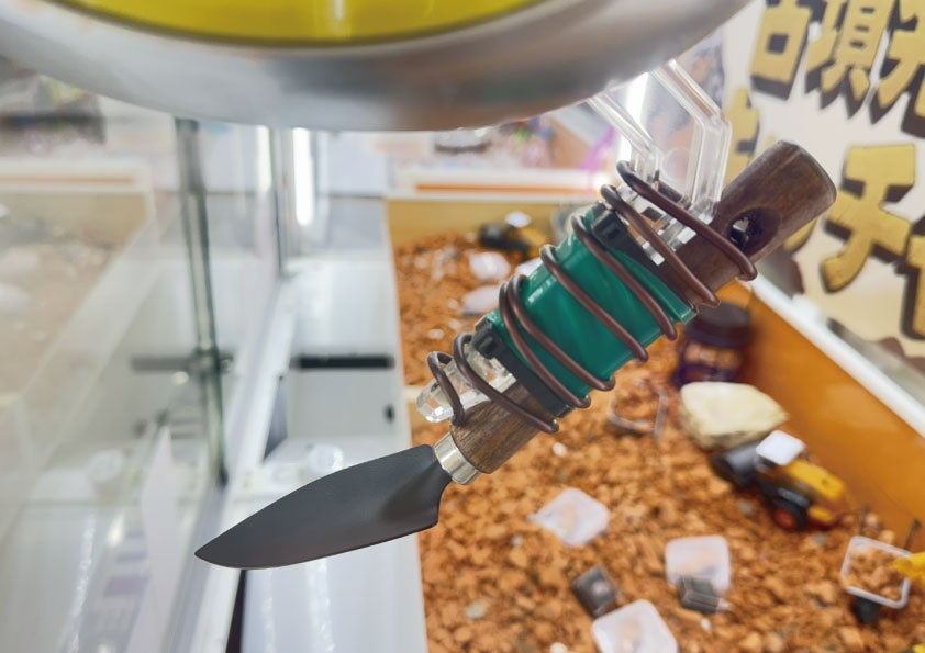 今回のクレーンゲームでは、筐体内に本物の砂を入れ、その中に景品を埋め込むことで、まるで考古学の発掘作業のような“疑似発掘体験”ができる仕様に。アームの先が熊手になっていて景品を掘り出す、新感覚のゲーム体験をお楽しみいただけます。