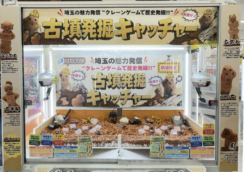 今回の“埼玉魅力発信クレーンゲーム”では、埼玉県民の日(11月14日)に合わせて、埼玉県行田市が誇る埼玉古墳群(さきたまこふんぐん)にちなんだ「古墳発掘キャッチャー」が登場します。