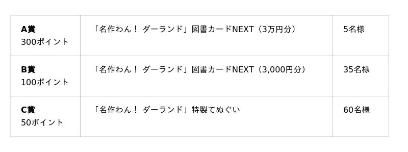 本キャンペーンでは購入書籍1冊ごとに本体価格の10%分のポイントを獲得できます(小数点以下は四捨五入)。また、各賞の必要ポイント数をためると複数プレゼントに応募いただけます。