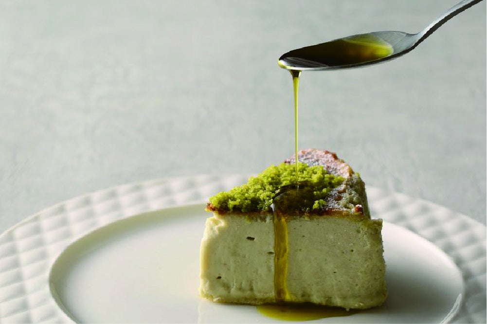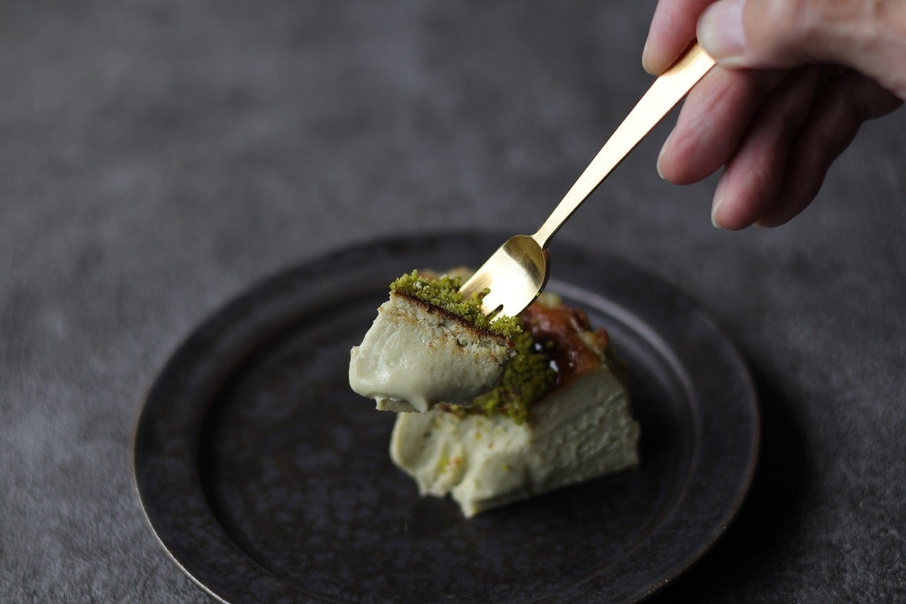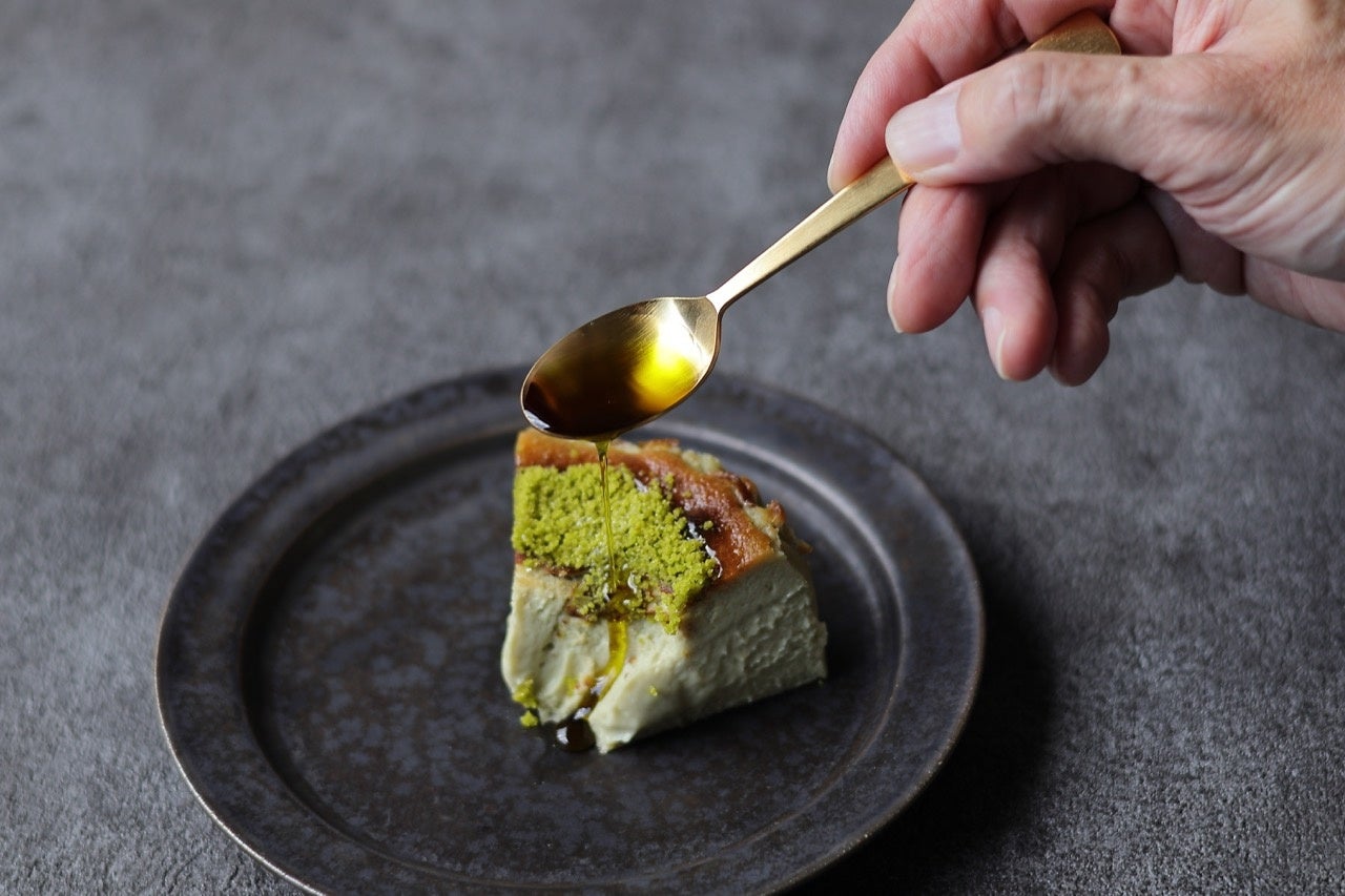 ケーキにひとさじかけると、ピスタチオの芳醇な香りがふわりと立ち上がり、チーズのコクと重なってまろやかな余韻が広がります。チーズのコクとピスタチオの芳醇な風味がさらに引き立てられ、まるで香りが弾けるような新しい感動体験が口の中に広がります。