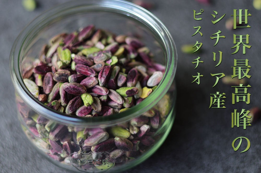 「ピスタチオの町」として知られるイタリア、シチリア島ブロンテ村産のピスタチオは、世界的にも別格の品質であると評価されています。火山性のミネラル豊かな大地と乾燥した気候の中で丹念に育まれたピスタチオは、香りが格段に強く、「食べるエメラルド」と呼ばれるほど深く美しい緑色をしています。また、2年に一度、奇数年にしか収穫されないことから「幻のピスタチオ」とも呼ばれています。