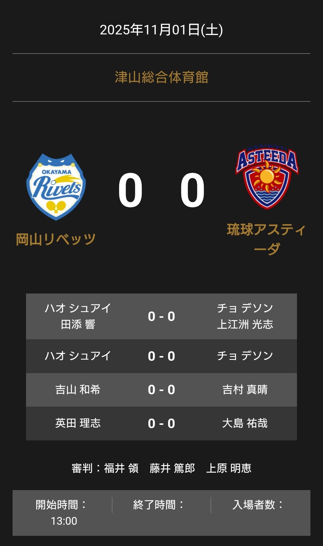 ノジマTリーグ 2025-2026 公式戦 11月1日開催 の「岡山リベッツ vs 琉球アスティーダ」のオーダーを発表いたします。
