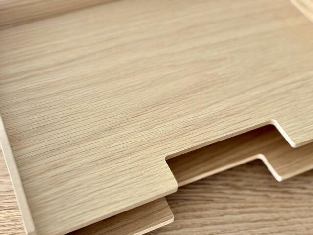 芯材にMDF、突板にオーク材を使用した、すっきり明るい色調の木製のトレー。