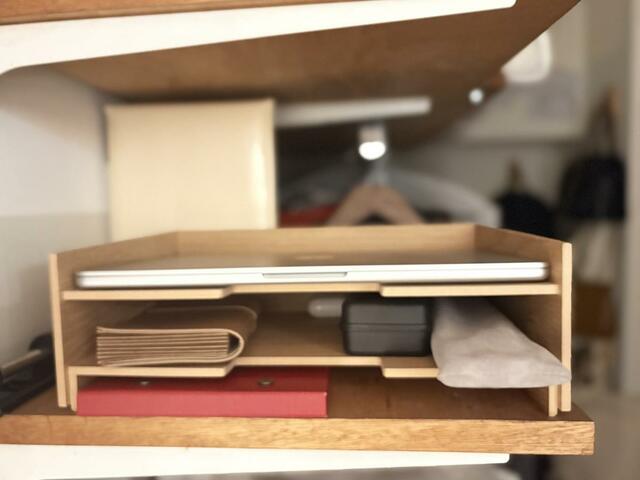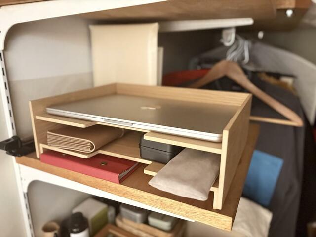 クローゼットの棚の一角に設置して、ノートやPCスタンドなど仕事に使うアイテムと一緒に置いています。