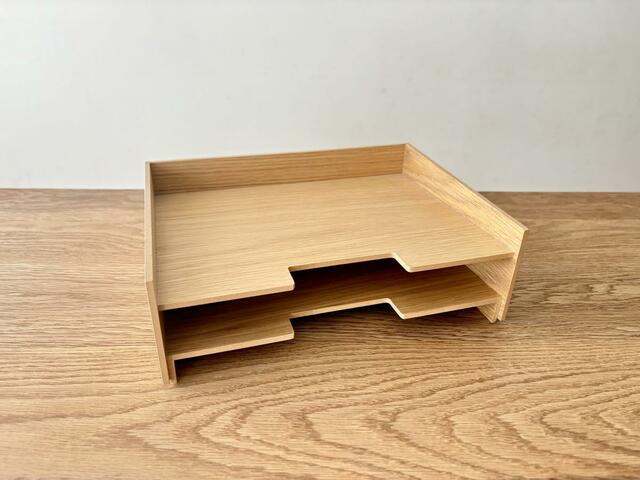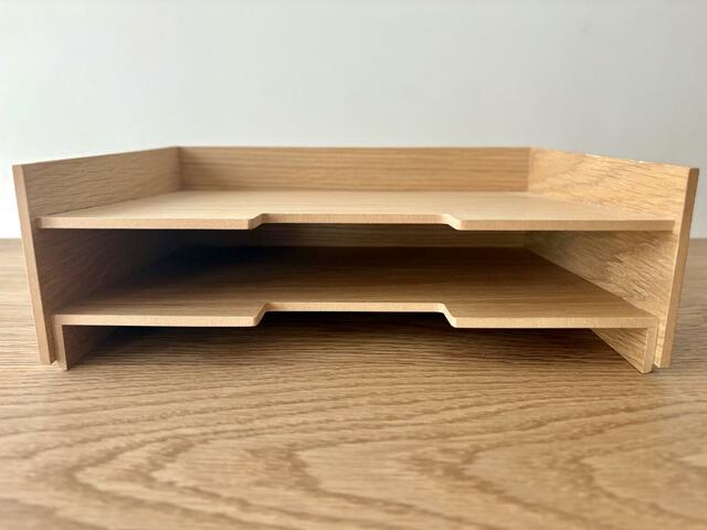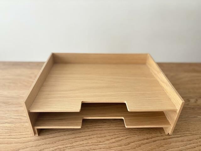 「木製書類整理トレー」は、A4サイズのプリントや郵便物、回覧などの整理、分類を想定したアイテム。