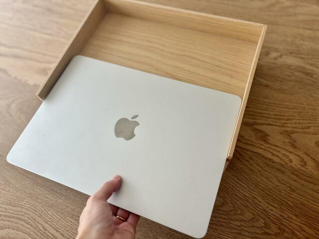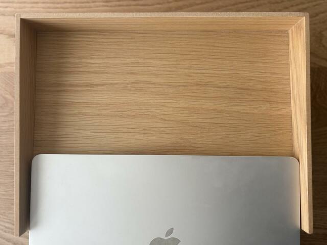 目についたのが、木製書類整理トレー。形状とデザインは理想通り、あとはMacBook Airの13インチが入るかどうか……