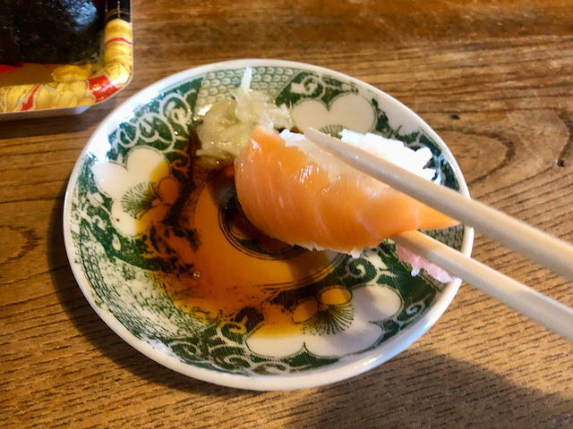早速蓋を開けて、醤油とガリを準備して(筆者はわさびが苦手です‥)、いただきましょう! まずは好物のサーモンをパクリ。