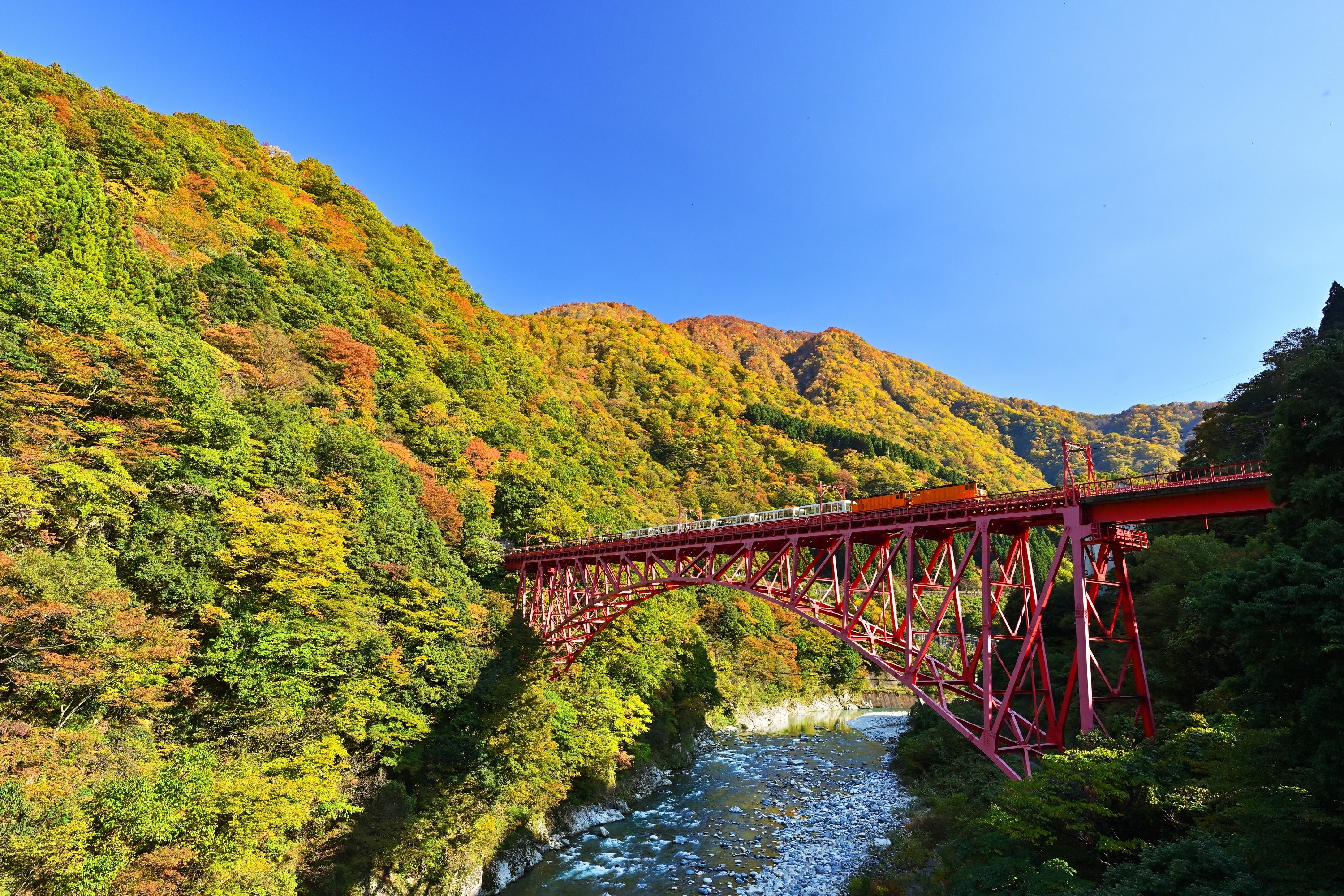 黒部峡谷の紅葉は、赤や黄色の広葉樹、緑の針葉樹、黒部川のエメラルドグリーンの鮮やかなコントラストが特徴で、トロッコ電車の車窓からは峡谷の自然美をご覧いただけます。
