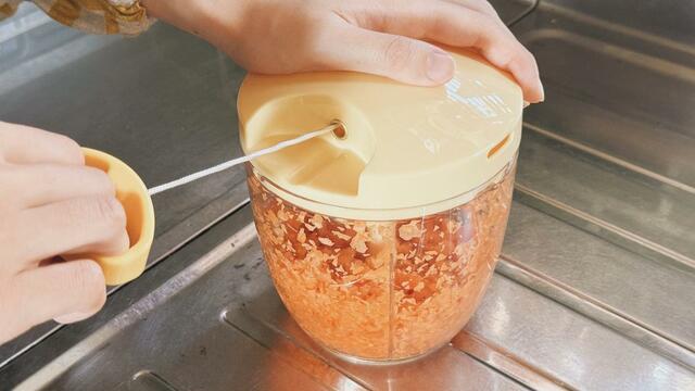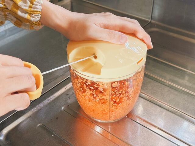 ですが、「ぶんぶんチョッパー」があれば、ざっくり切って容器に入れ、持ち手を引っ張るだけでOK!