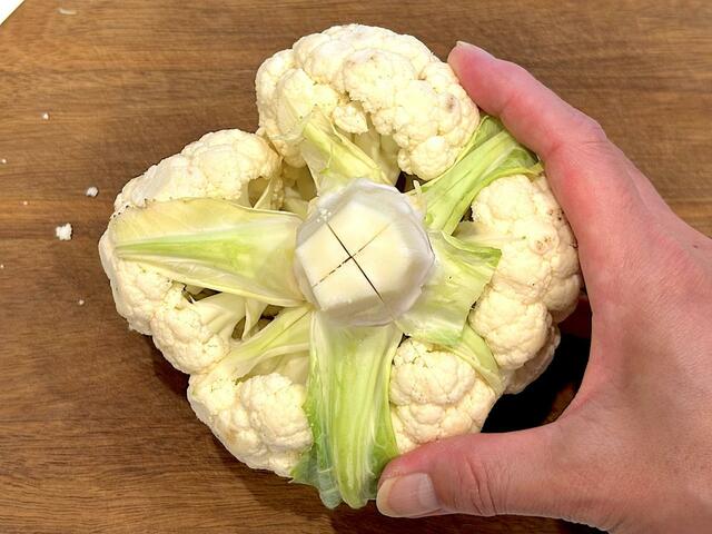 1. カリフラワーは、茎のまわりについた硬い部分を落とし、茎の断面に十字の切り込みを入れる。