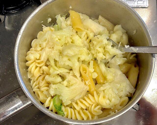 4. フォークやスプーンでカリフラワーをほぐしながらパスタと絡める。粉チーズを加えてよく混ぜたらできあがり。