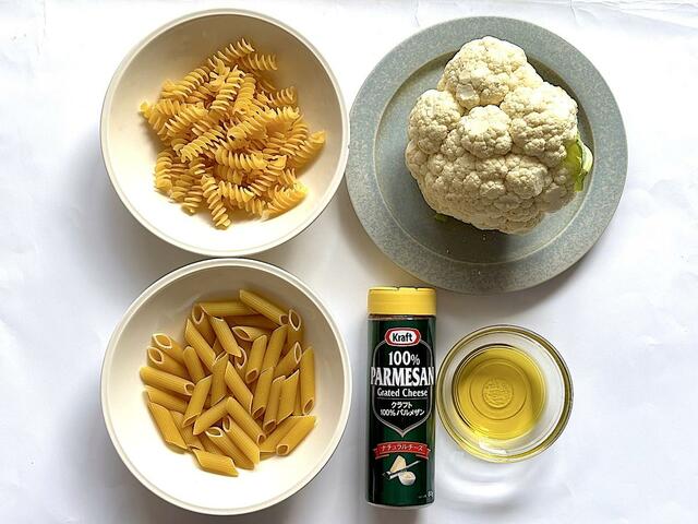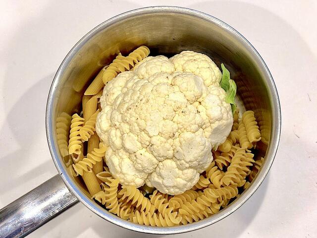 カリフラワーはカットせず、丸ごと使用。パスタと一緒に水からゆでるだけで簡単です。