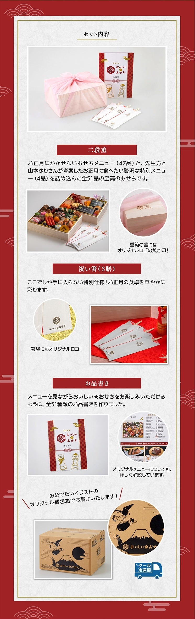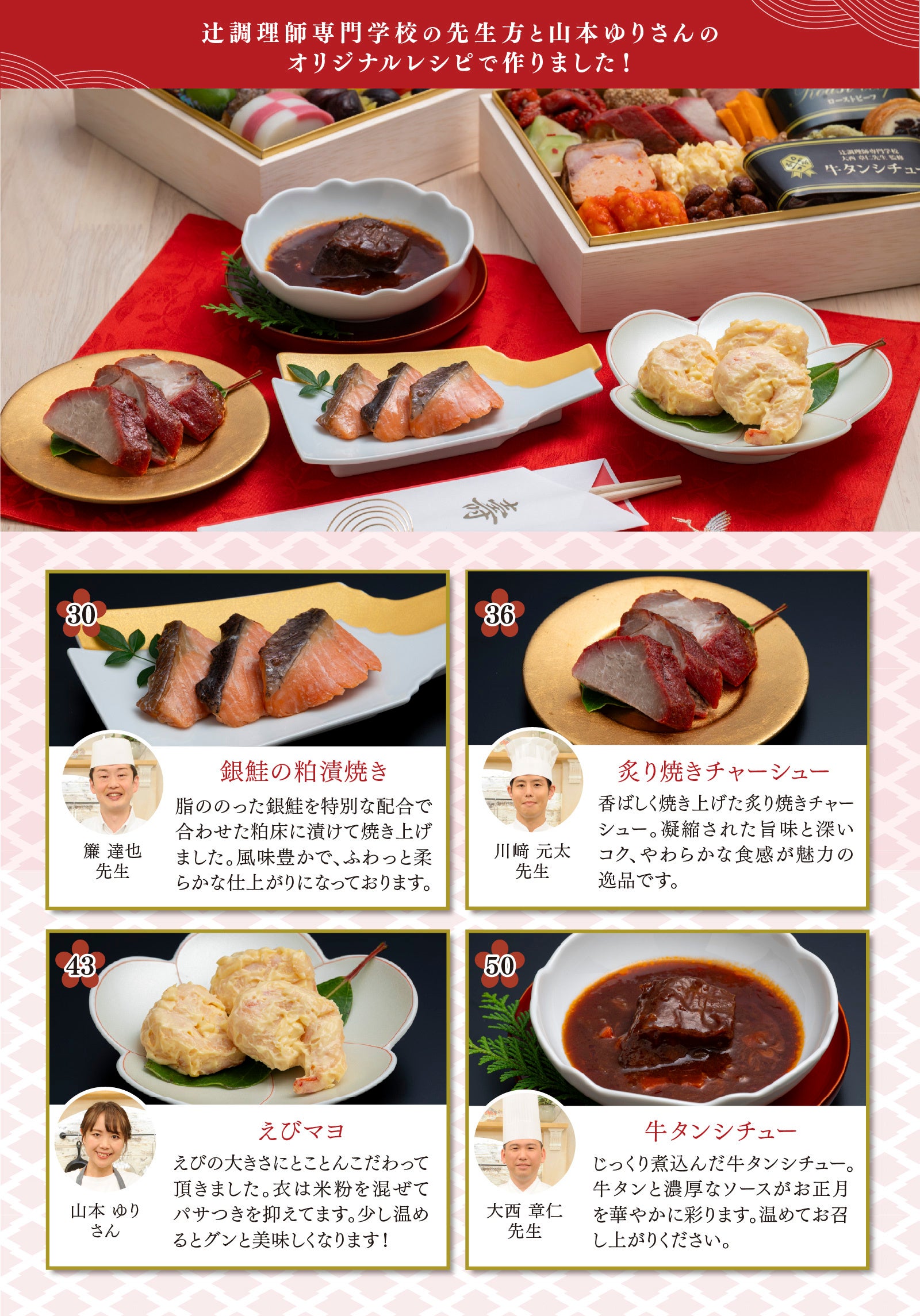 本商品は全51品の二段重でその全てを番組講師陣が監修しています。内容は「お正月にかかせないおせちメニュー(47品)」と、講師陣が考案した「お正月に食べたい贅沢な特別メニュー(4品)」で、辻調理師専門学校の先生方と山本ゆりさんの想いと美味しさが詰まった至高のおせちです。