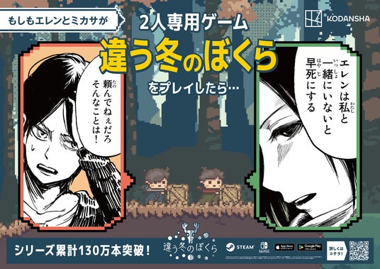 『違う冬のぼくら』と『違う星のぼくら』は、インディゲームクリエイター・ところにょりが手掛ける2人プレイ専用パズルアドベンチャーゲームです。今回の広告は「2人プレイ専用」という本シリーズを、講談社の人気マンガのキャラクターたちがプレイする様子をイメージしたものとなります。