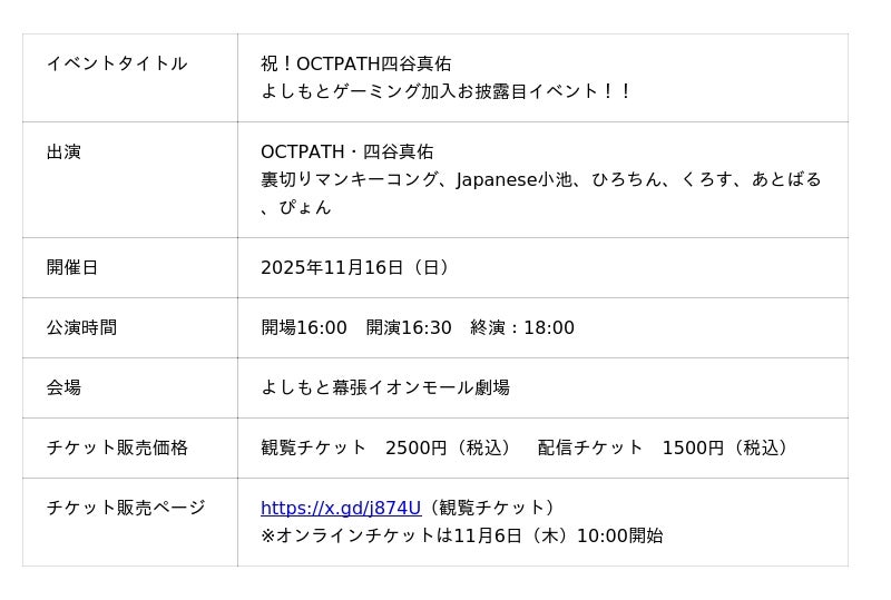また、2025年11月16日(日)によしもと幕張イオンモール劇場にて、四谷の加入を記念したイベント「祝!OCTPATH四谷真佑よしもとゲーミング加入お披露目イベント!!」を開催します。