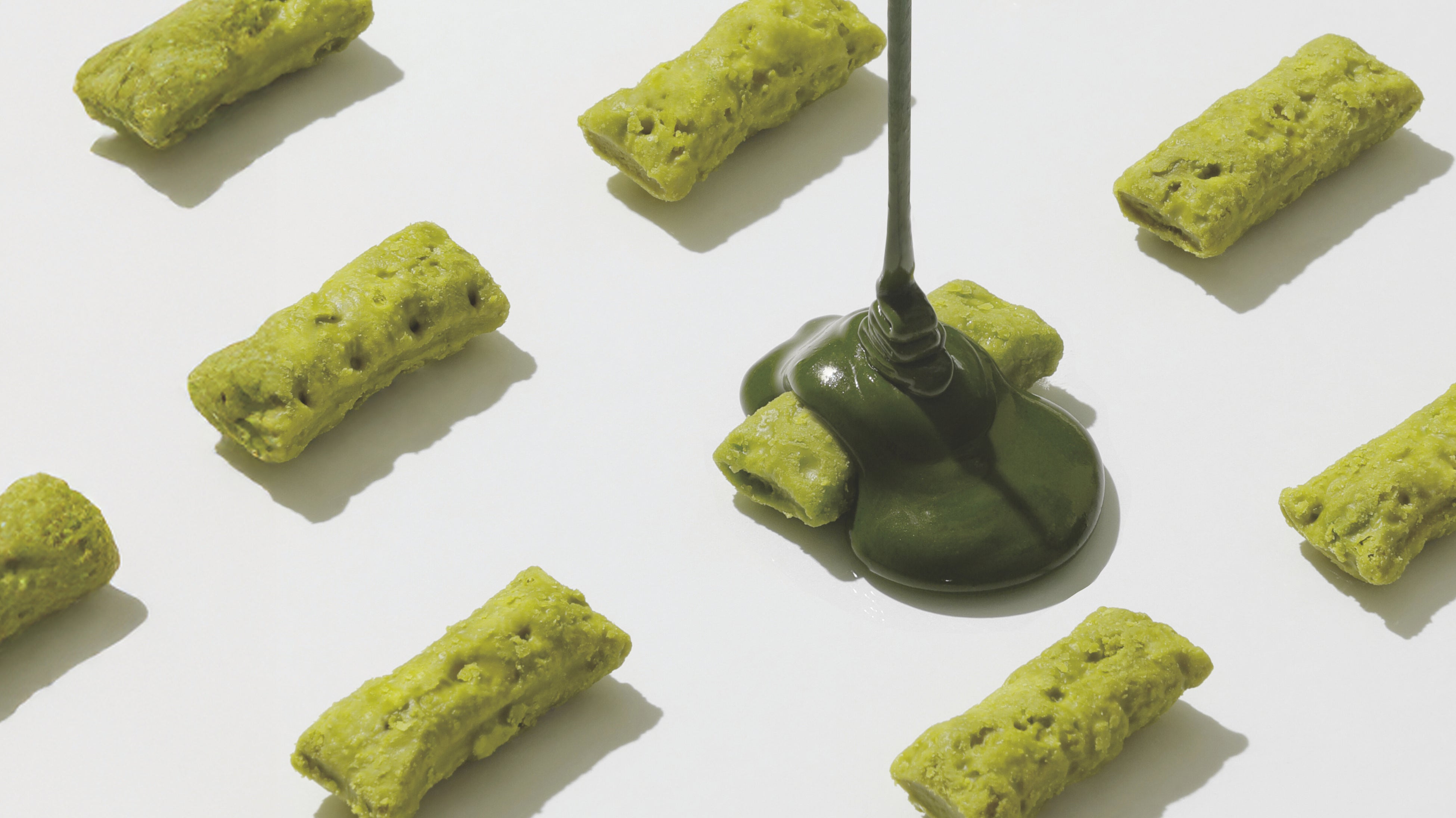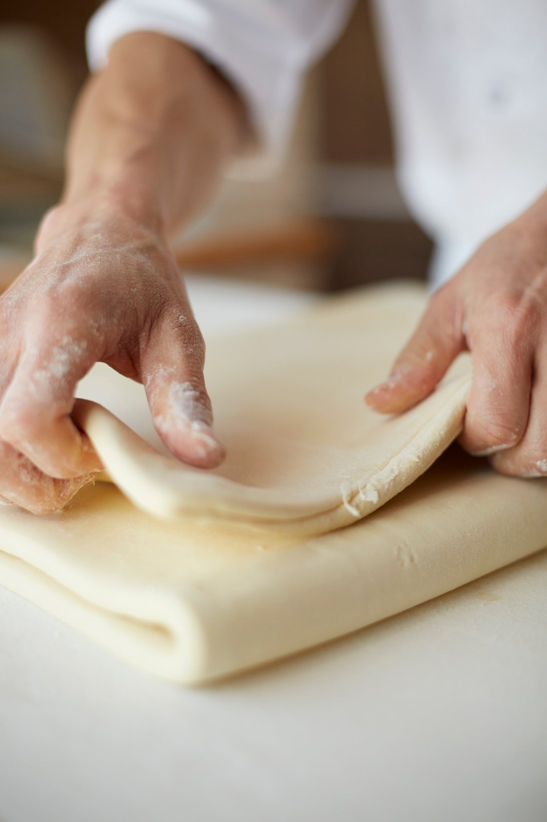 coneriのスティックパイに使用するのは、国産の小麦粉や大豆を原料とした厳選された「酵豆粉」を独自にブレンドした“こねり粉”。パイ生地作りの要の「こねる」「折る」「伸ばす」の工程は、熟練のパイ職人による手わざでこそ成せる業。季節・天候・温度・湿度とあらゆる些細な変化も見逃さず、生地の声に耳を傾け会話しながら、約1,000層のパイ生地に仕上げます。