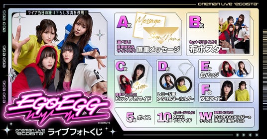 EGOEGGのラッフルくじ「ONEMAN LIVE ”EGOISTA”ライブフォトくじ」」が実施決定!本ライブ撮りおろしのブロマイドなどがラインナップいたします。詳細は特設ページをご確認ください。