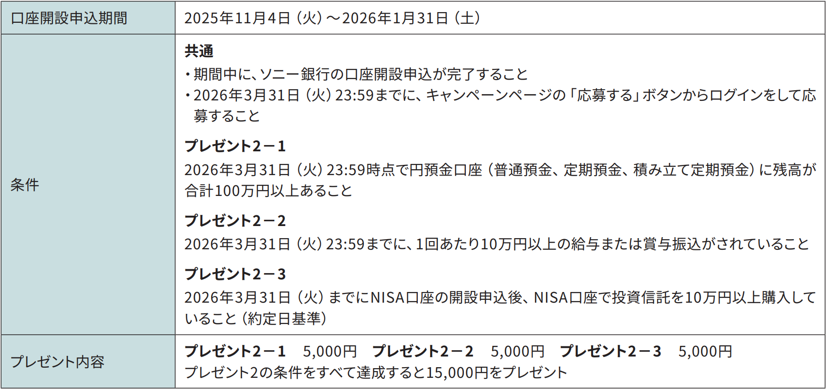 各条件のプレゼント合計額は、2026年4月下旬にソニー銀行の円普通預金口座に入金します。