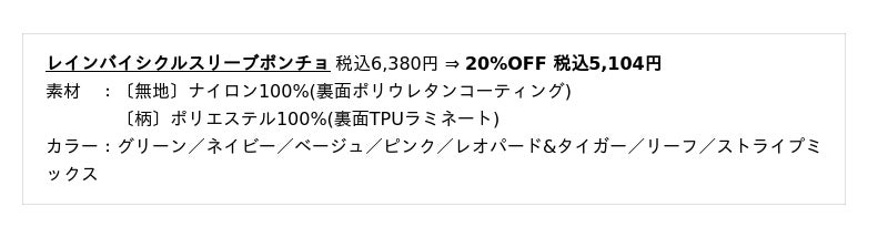 アウトドアシーンはもちろん、自転車に乗ることを考えて開発したレインポンチョです。光を反射させるリフレクターや手の甲が濡れないよう手甲カバーなどが備わっており、毎日の通勤・通学に大活躍。丈が長めなので男性の着用も可能です。