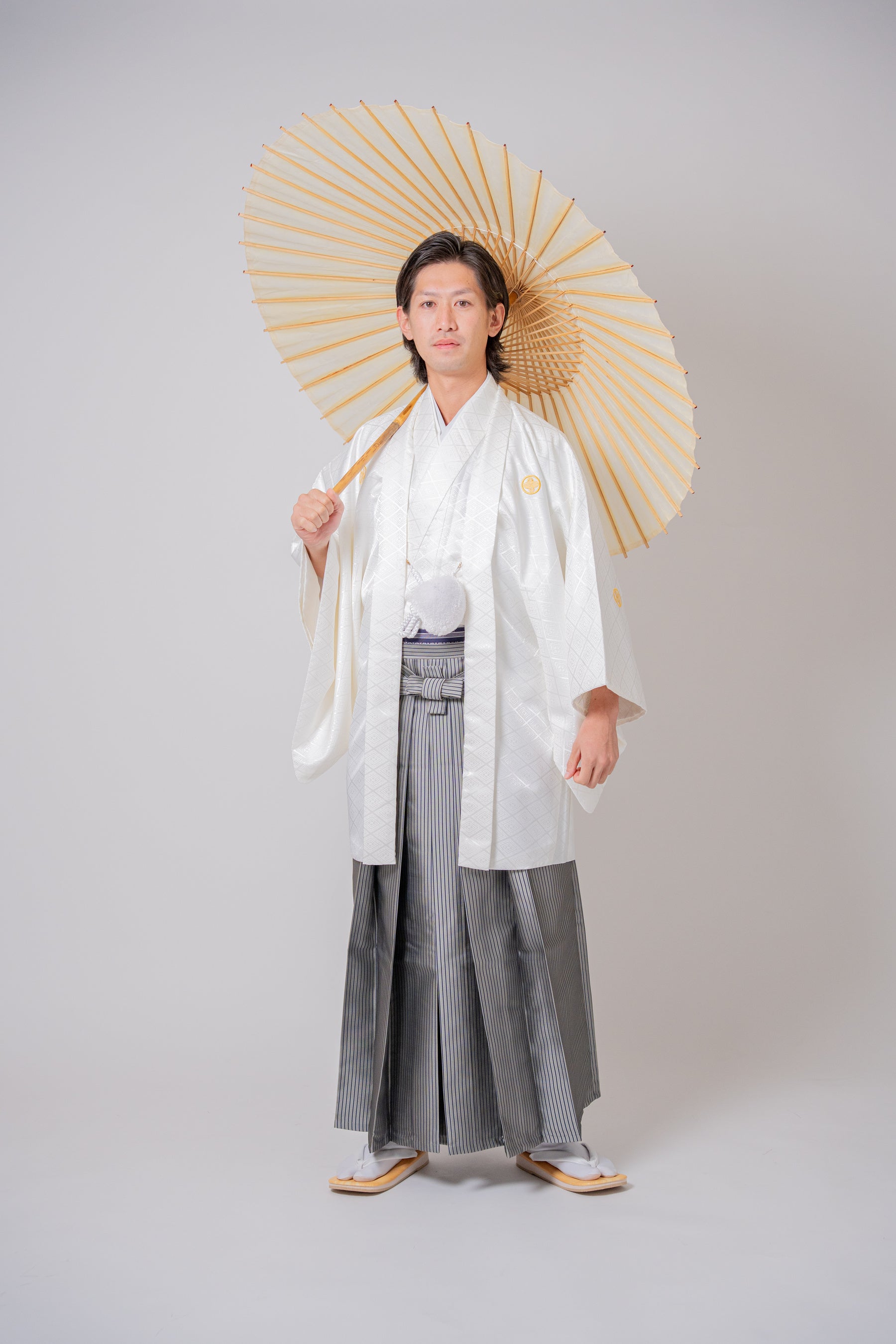 ホワイト紋付(フォト婚・海外風スタイルにも対応)モダンでスタイリッシュな印象。洋装背景にも映える万能カラー。