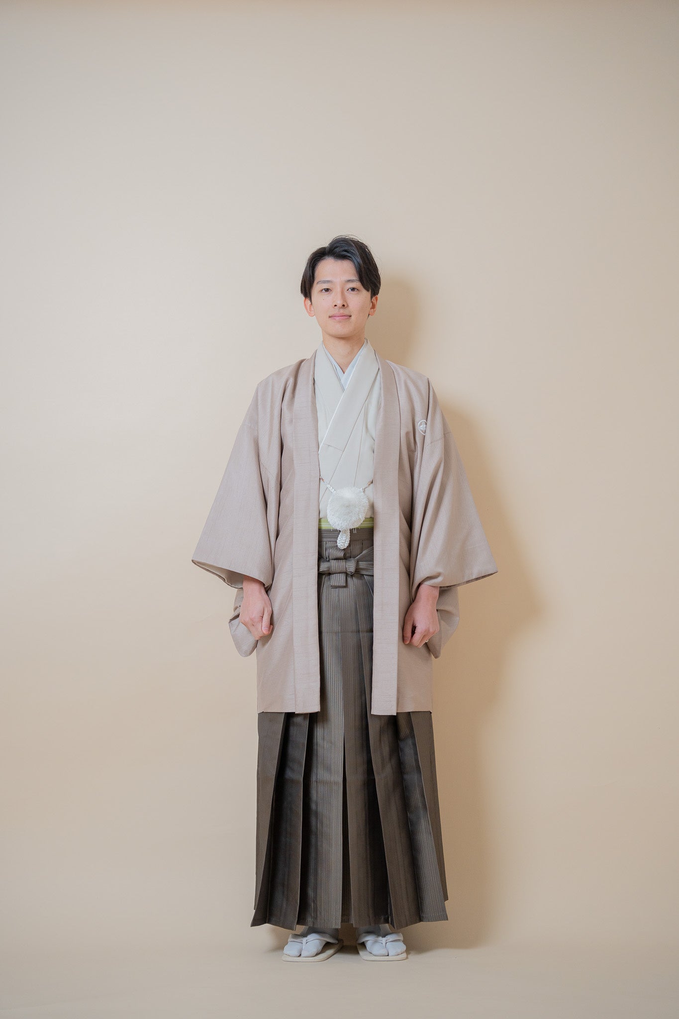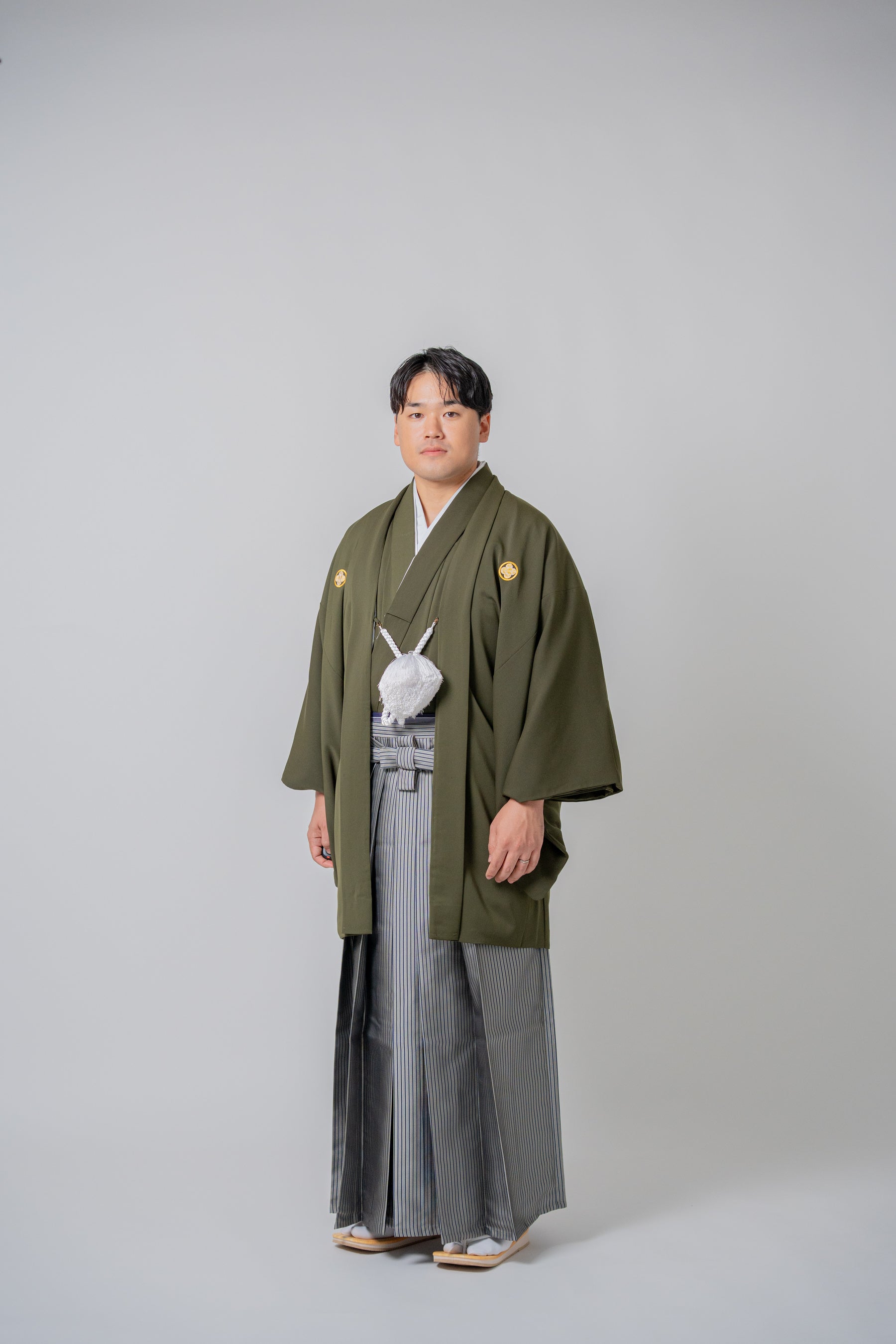 カーキ紋付(抜け感&お洒落)都会的で落ち着いた印象。個性を出したい新郎に人気。