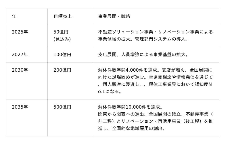 2030年売上高200億円、そして解体工事業界No.1という目標は、2025年度の売上見込み50億円という確かな成長の道筋の上にあります。さらに2035年売上高500億円の実現に向けては、関東から関西へと進出し、既存の解体事業の前工程となる不動産事業と、後工程となるリノベーション・再活用事業を推進することで、全国的な地域雇用の創出にも貢献してまいります。この革新的な事業モデルと、多様性を力に変える強い組織力があれば必ず実現できると確信しています。