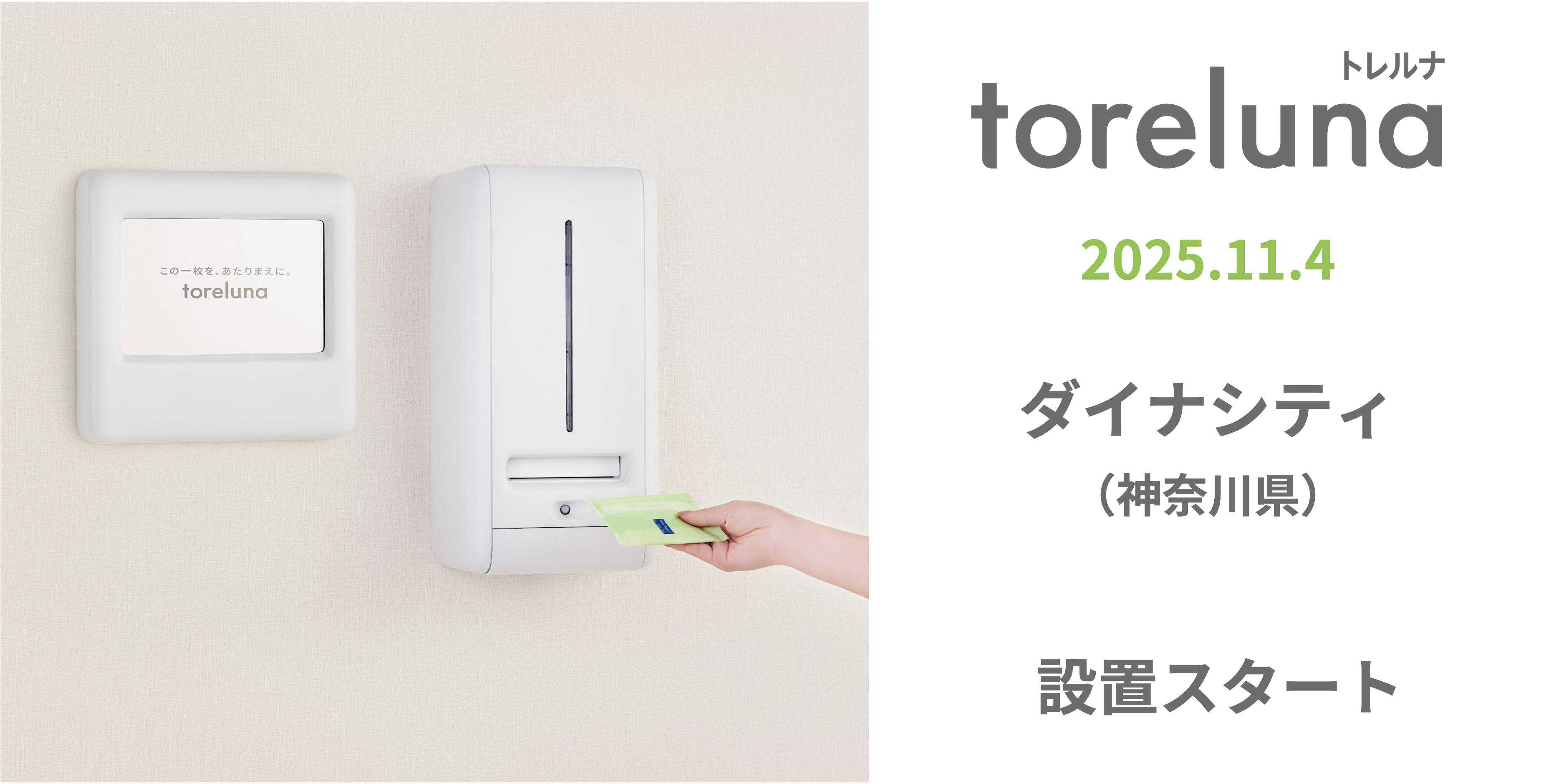 株式会社ネクイノ(大阪市北区、代表:石井 健一)は、トイレの個室で生理用ナプキンを常備し無料で提供するサービス「toreluna(トレルナ)」(以下 トレルナ)を、ダイナシティへ設置し、サービスの提供を開始いたしました。