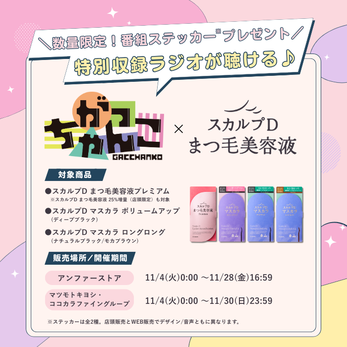 「スカルプDまつ毛美容液」シリーズの対象商品をご購入いただいたお客様に、「がっちゃんこ」の特別収録ラジオが聴けるQRコード付きステッカーをプレゼント!店頭・WEB購入で収録内容が異なり、各曜日から真剣さと理論でガチガチになっている4人が集まった【ガチガチ!がっちゃんこ】、ほのぼのした平和なトークを繰り広げる【ほのぼの!がっちゃんこ】、2つのバージョンを収録しました。 “幻の収録回”になること間違いなし!ぜひ2種類とも集めて、ここだけの曜日を超えた特別トークをお楽しみください。