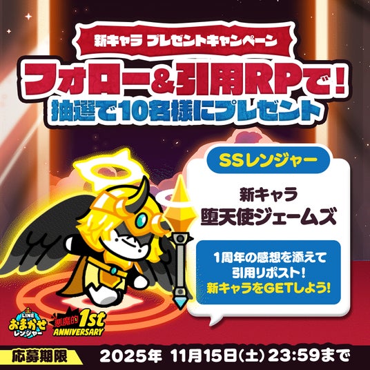 期間中、「LINE おまかせレンジャー」の公式X(旧Twitter)アカウント(https://x.com/LINE_OMAREN_JP )をフォローしてキャンペーンポストに1周年の感想を添えて引用リポストすると、抽選で新SSレンジャーが当たるキャンペーンを開催します。【賞品】