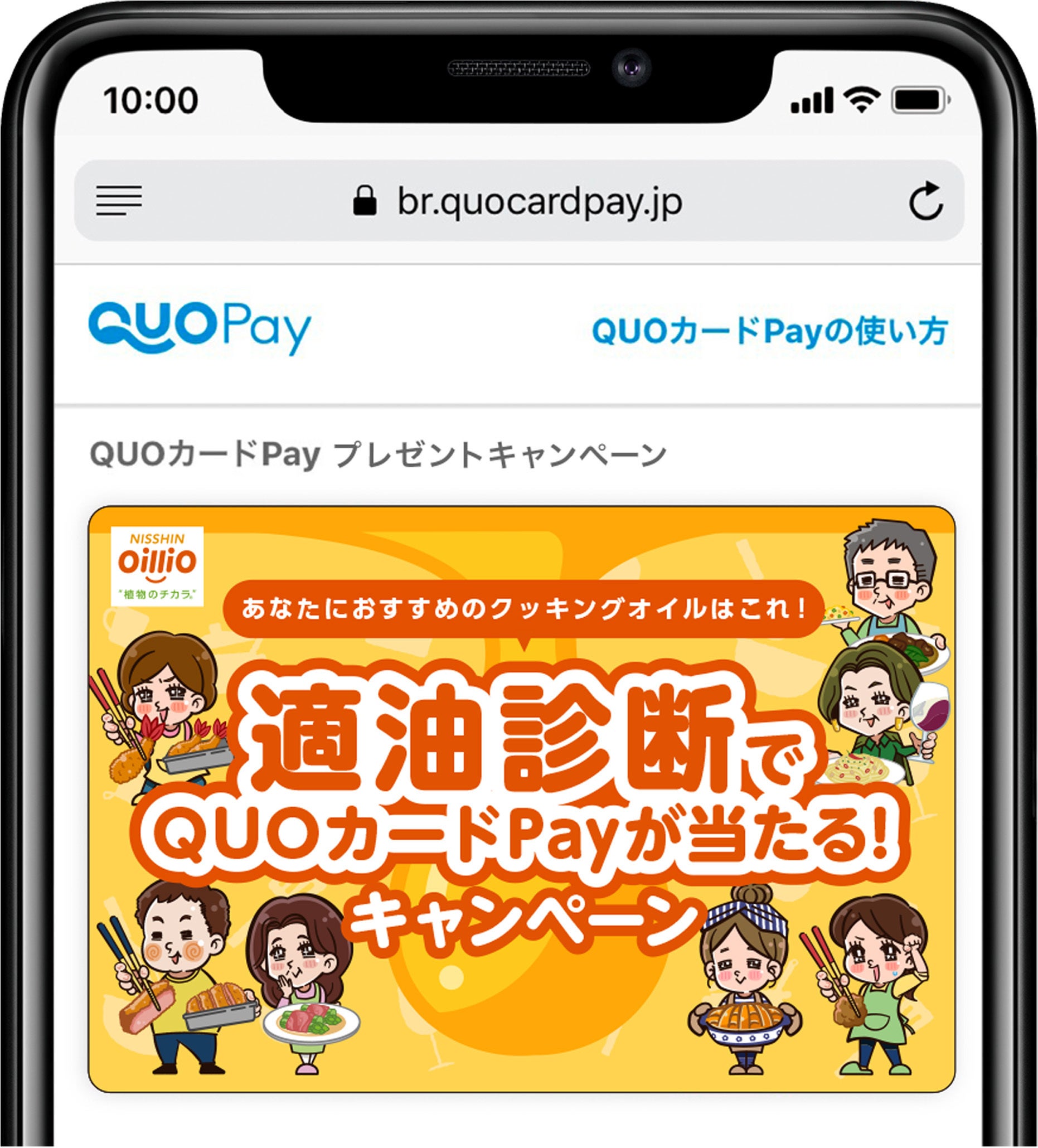 株式会社クオカード(以下当社、本社:東京都中央区、代表取締役社長:近田 剛)が展開するスマートフォンで使えるデジタルギフト「QUOカードPay(クオ・カード ペイ)」は日清オイリオグループ株式会社が11月4日(火)より開催する「適油診断でQUOカードPayが当たる!キャンペーン」で採用されました。本キャンペーンでは、期間中にキャンペーンサイトから適油診断を実施し、対象商品を購入したレシートで応募すると、オリジナルQUOカードPay1,000円分が抽選で1,000名様に当たります。