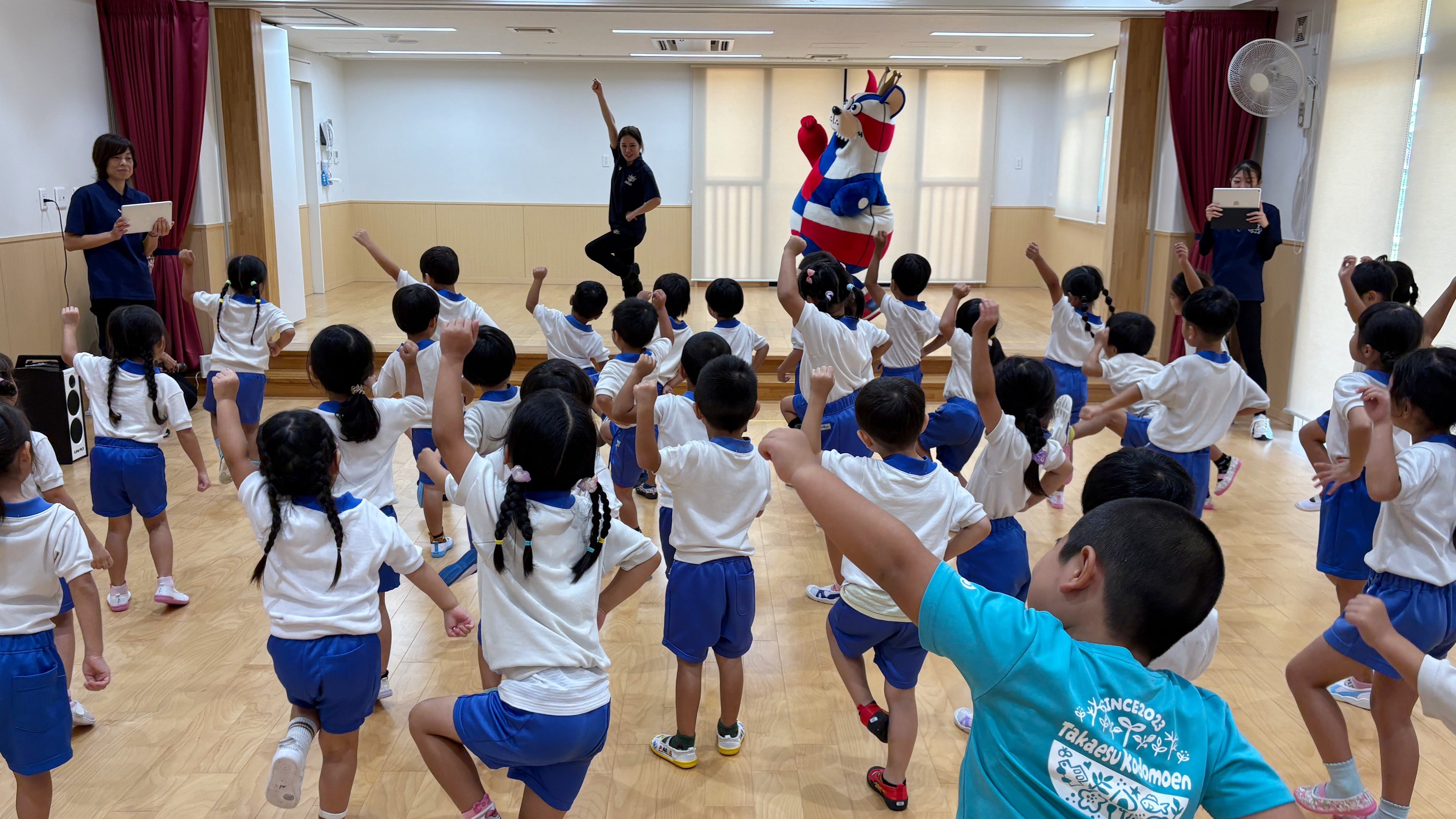 ダンス訪問では、キングスやゴーディーに関するクイズやストレッチを実施しました。ボール遊びでは、グループごとでパス練習を行ったり、「GO GO KINGS!」の掛け声でお友達を応援するなど、会場が一体となって盛り上がりました。