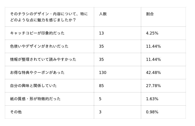 この結果から、消費者がチラシを手に取る・読む・行動するかどうかは、主に次の2つの実利的な視点に基づいていることが分かります。