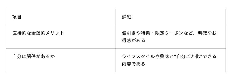 「お得感」や「関心への一致」が魅力を感じる最大の要素