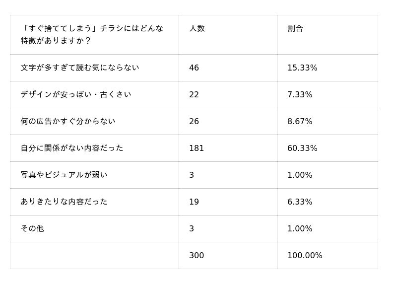 すぐに捨てられてしまうチラシの特徴として、「文字が多すぎて読む気にならない」(15.33%)、「何の広告かすぐ分からない」(8.67%)が挙げられました。